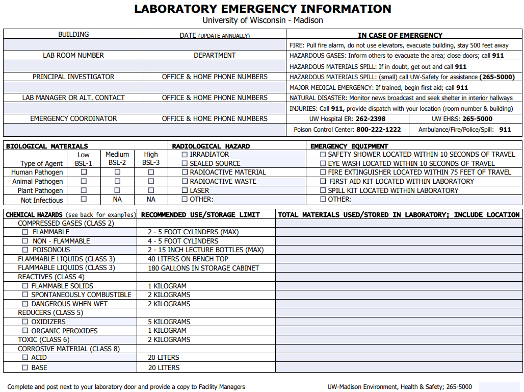 Have a current and accurate lab door emergency card. These door cards provide first glance information to an emergency responder. They allow responders to ensure they are prepared for whatever may be in the lab and warn responders who may not be adequately protected from the listed hazards not to enter. They also provide necessary contact information for custodians or others who may find or hear something amiss in the lab after hours